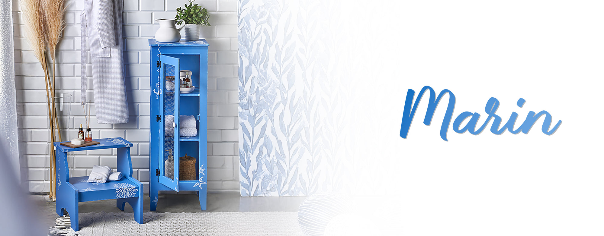Bu koleksiyon; deniz kabuğu ve mercan desenleri, canlı mavi yüzeyler, el boyaması detaylar ve fonksiyonel küçük mobilyalar ile hem modern hem de coastal dekorasyon tarzlarına mükemmel uyum sağlar. Marin Koleksiyonu, banyo, mutfak, antre ve yaşam alanlarında sahil esintisini güçlü bir şekilde hissettirir.