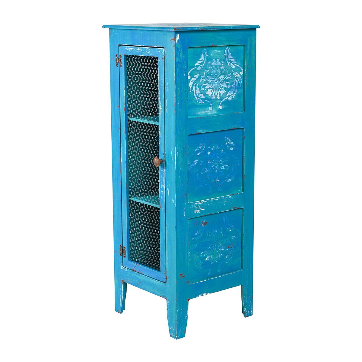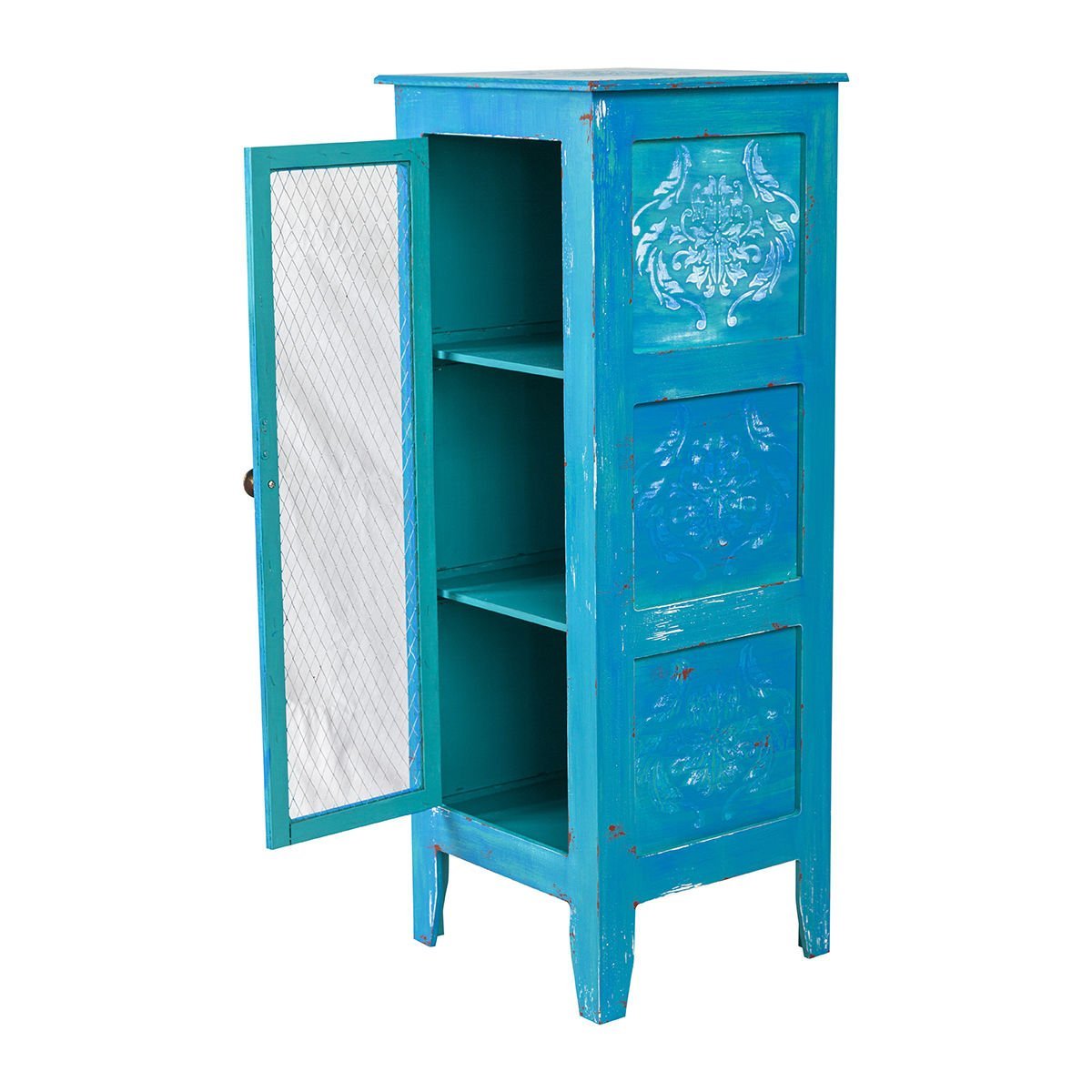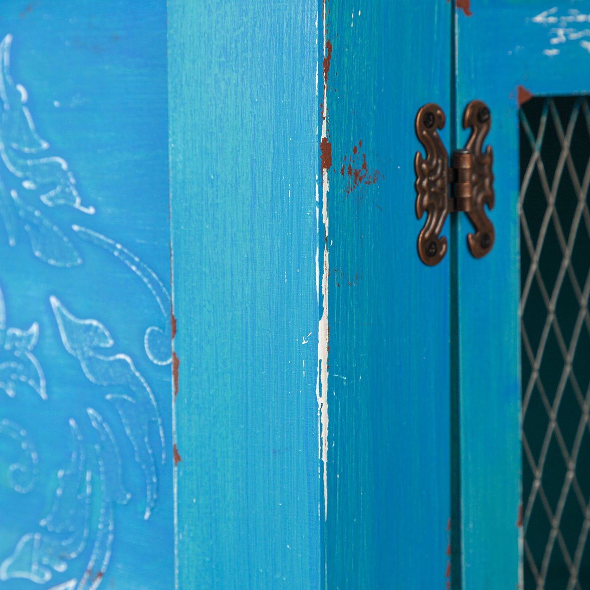 Aqua Tel Dolap, elde boyanarak rölyef kabartmalarla zenginleştirilmiş dekoratif bir tasarımdır. Ahşap gövdesi, tel kapak yapısı ve kullanışlı raflarıyla hem düzen sağlayan hem de mekâna renk katan bu özel dolap, mutfak, banyo, antre ve yaşam alanlarında şık bir tamamlayıcı olarak kullanılabilir.