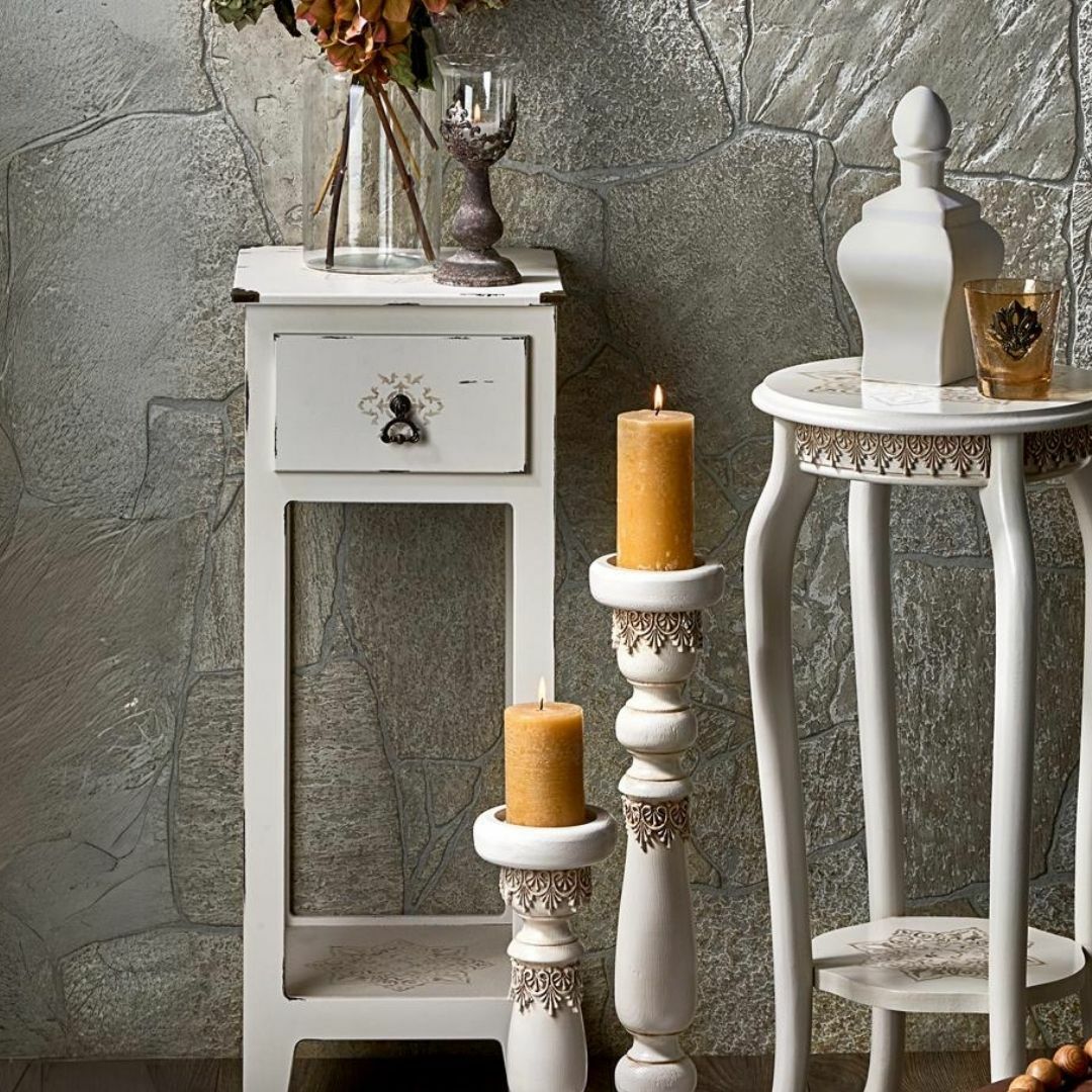 Zemin akrilik boya ile boyandıktan sonra üzerine stencil ve eskitme tekniği uygulanmıştır.