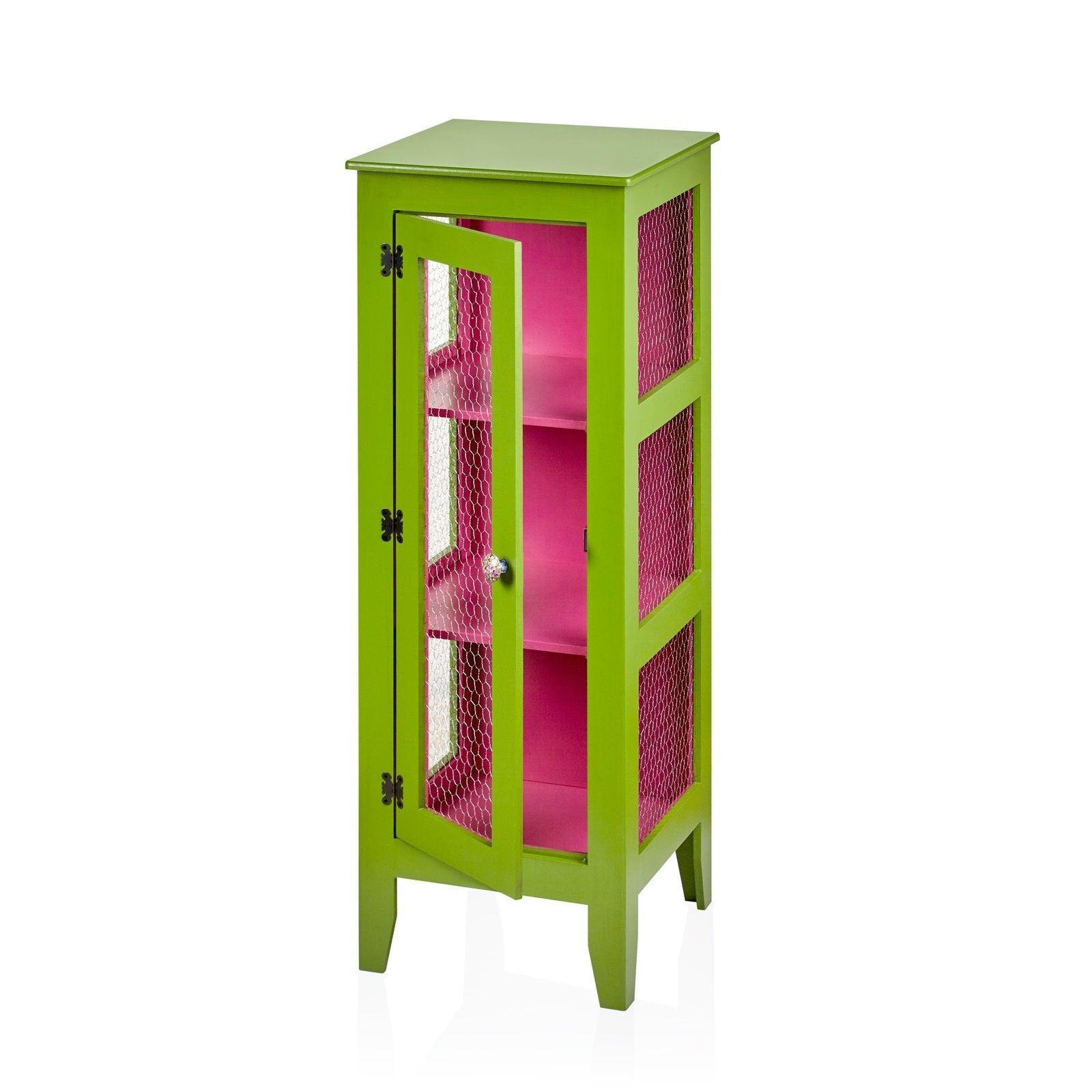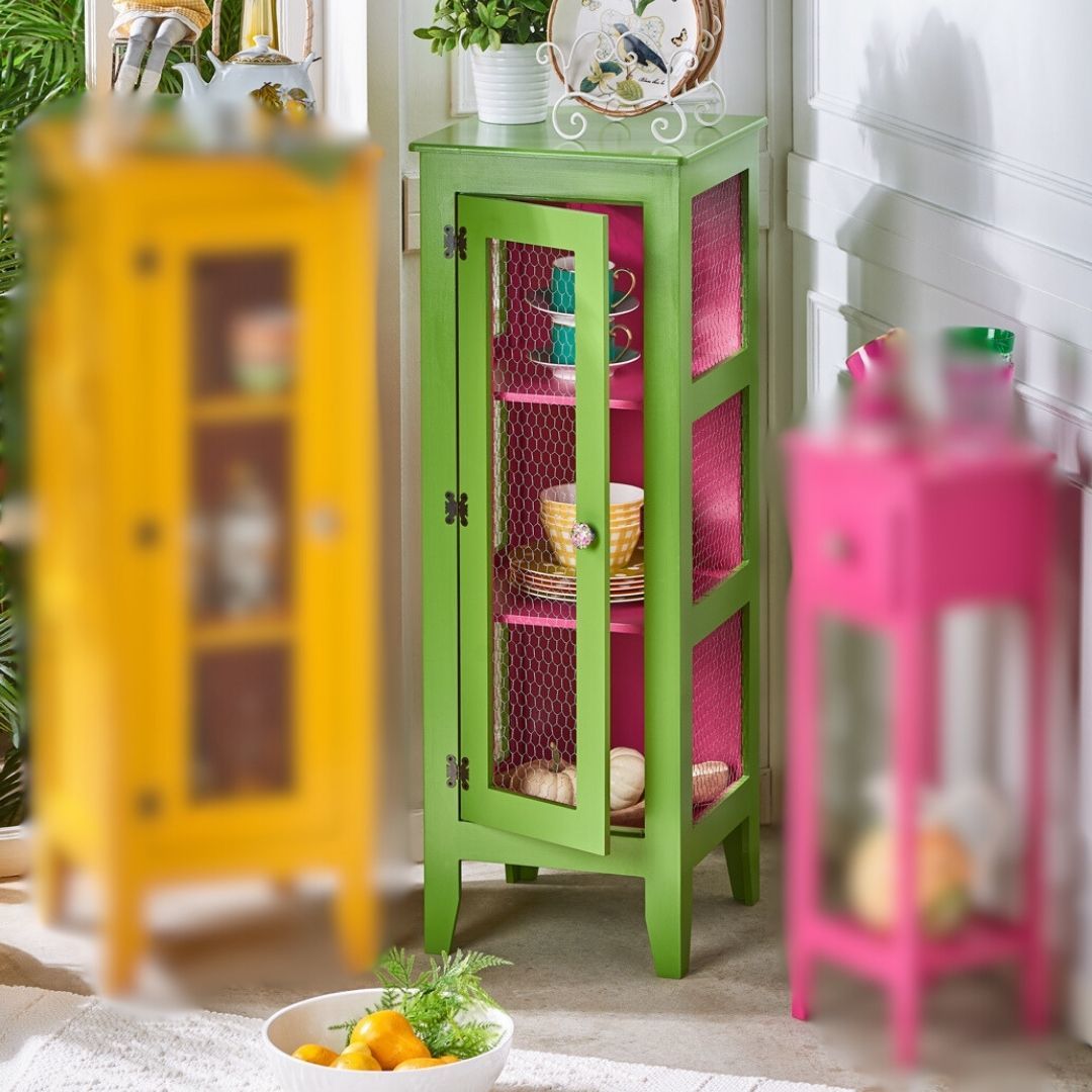 Yeşil Tel Dolap, dışı yeşil içi pembe renklere sahip, elde boyanmış ahşap gövdesi ve tel kapak yapısıyla özellikle renkli mutfak ve banyolar için tasarlanmış şık ve fonksiyonel bir dolaptır. Kullanışlı rafları ve canlı renk uyumu sayesinde bulunduğu mekâna neşeli ve dekoratif bir dokunuş katar.